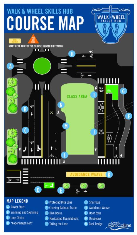 The Fort Collins Walk and Wheel Skills Hub is located at the intersection of W. Drake Rd. and Dunbar, off the Spring Creek Trail.