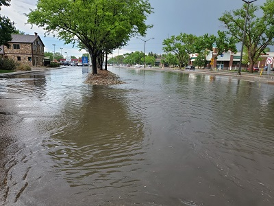 College Ave. just south of Drake Rd. looking north. A quick afternoon rainstorm on May 31, 2020 resulted in street flooding.