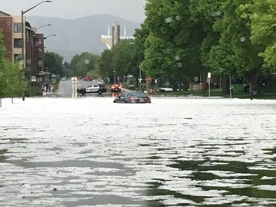 Don’t drive, walk or bike through floodwaters. Twelve inches of flowing water can float a small car. Streets can quickly become stream channels, especially if inlets get clogged with debris or hail. It is better to be late and safe than floating in your car and needing to be rescued.