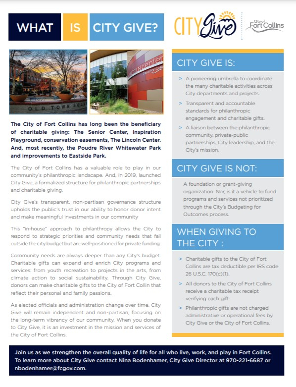 Through City Give, donors can make charitable gifts to the City of Fort Collins that reflect their personal and family passions.