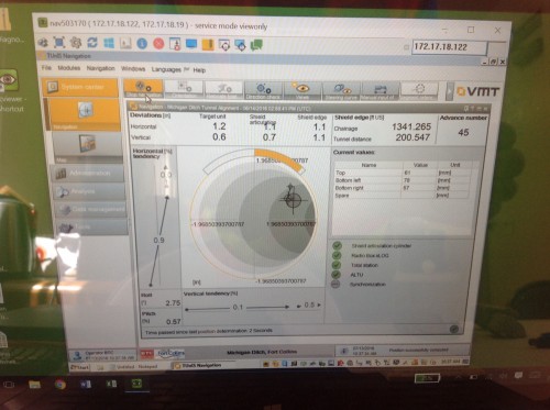 The laser beam from the tunnel control system allows the TBM operator to stay on line and grade.