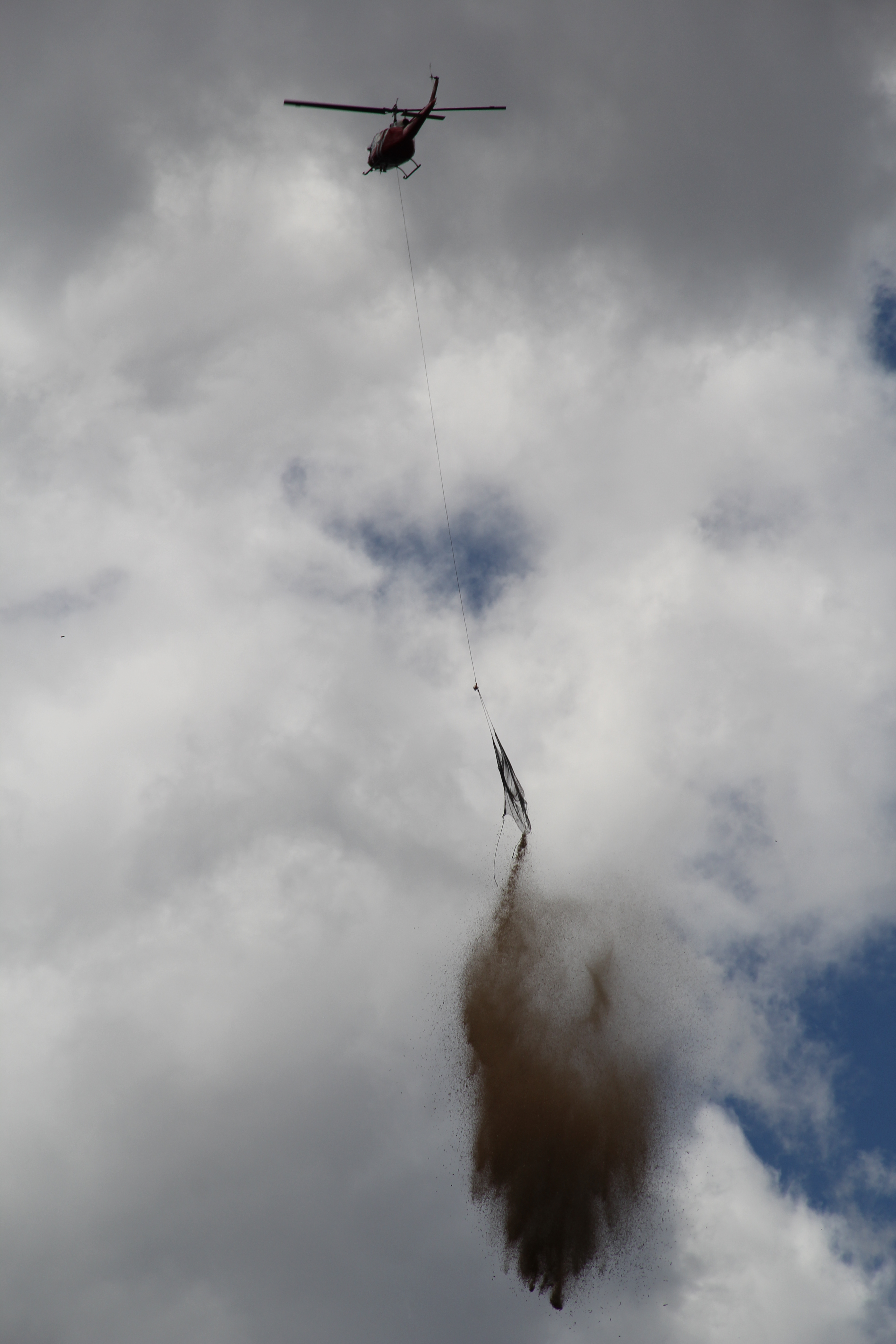 Helicopters drop wood mulch on the burn area.