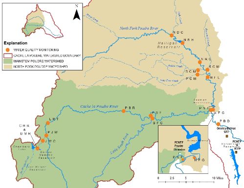 Water quality is monitored at nine locations on the main stem of the Cache la Poudre River, one location on the Little South Fork Poudre River, and nine locations on the North Fork Poudre River, including Seaman Reservoir. The monitoring program consists of 11 routine sampling events from April through November. Monitoring occurs bimonthly during snowmelt runoff to account for the high variability/changes in water quality driven by rapidly changing streamflow. After snowmelt runoff, routine monitoring is conducted on a monthly basis, unless significant changes in water quality prompt increased frequency in monitoring.
